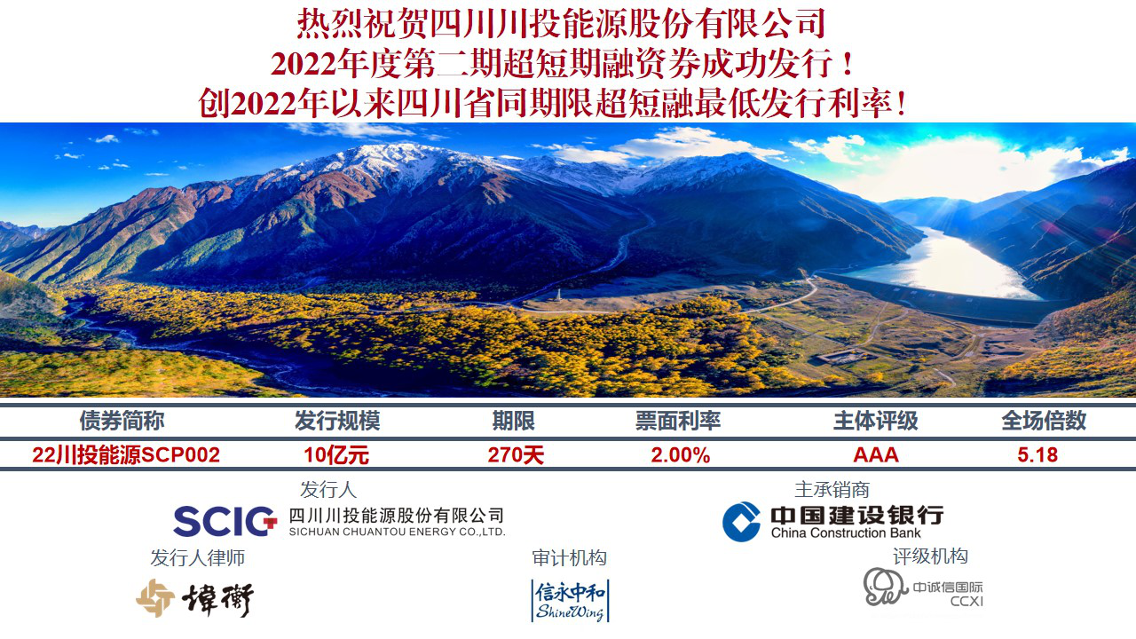2022年8月3日,川投能源成功發(fā)行2022年度第二期超短期融資債券,總金額10億元,期限270天,利率2.0%,全場倍數(shù)5.18倍,創(chuàng)2020年以來四川省同期限超短融最低發(fā)行利率。
