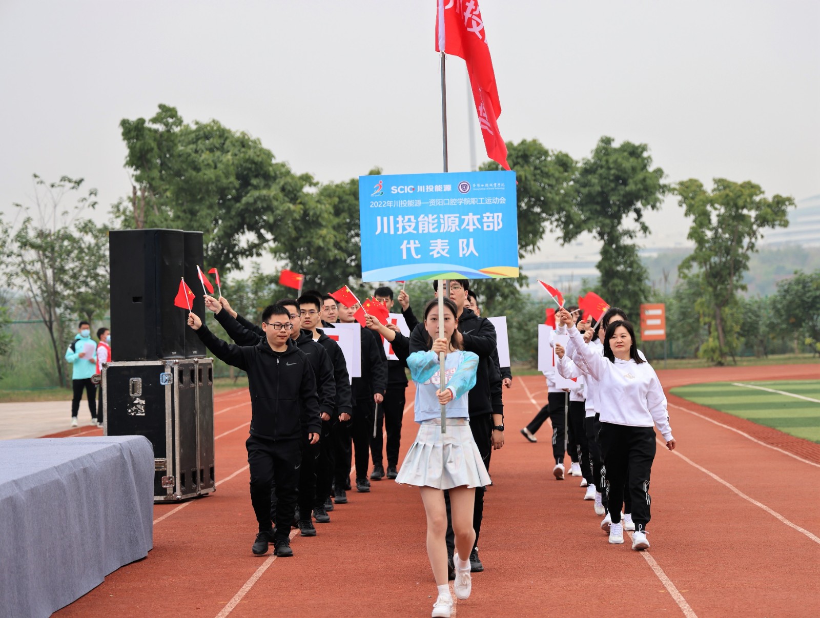 9時30分,楊洪宣布:“2022年川投能源-資陽口腔職學院職工運動會開幕!”彩煙騰空而起,全場掌聲雷動,歡呼不斷,正式拉開比賽帷幕。