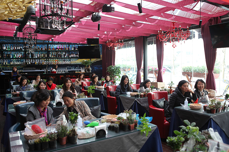 隨后,園藝?yán)蠋熛虼蠹医榻B了多肉植物的類別品種、形態(tài)特征、栽培方法以及微景觀的藝術(shù)設(shè)計(jì)與賞鑒。在體驗(yàn)環(huán)節(jié),面對(duì)一棵棵萌態(tài)可掬的“小鮮肉”,栩栩如生的小擺飾,精美別致的花盆,大家興奮不已,躍躍欲試。工作中干練的女漢子變成了心靈手巧的園藝師,她們小心翼翼地將嬌柔的植物安入花內(nèi),鋪上彩色石子,放上小飾品,每個(gè)人都發(fā)揮著豐富的想象和新奇的創(chuàng)意,一座座“迷你小花園”各具特色,極富設(shè)計(jì)感。大家紛紛拿出手機(jī)拍下作品,記錄下活動(dòng)的美好瞬間。喜歡養(yǎng)花的姐妹們還向老師請(qǐng)教花卉種植和養(yǎng)護(hù)知識(shí),每個(gè)人的臉上都洋溢著輕松和愉悅。