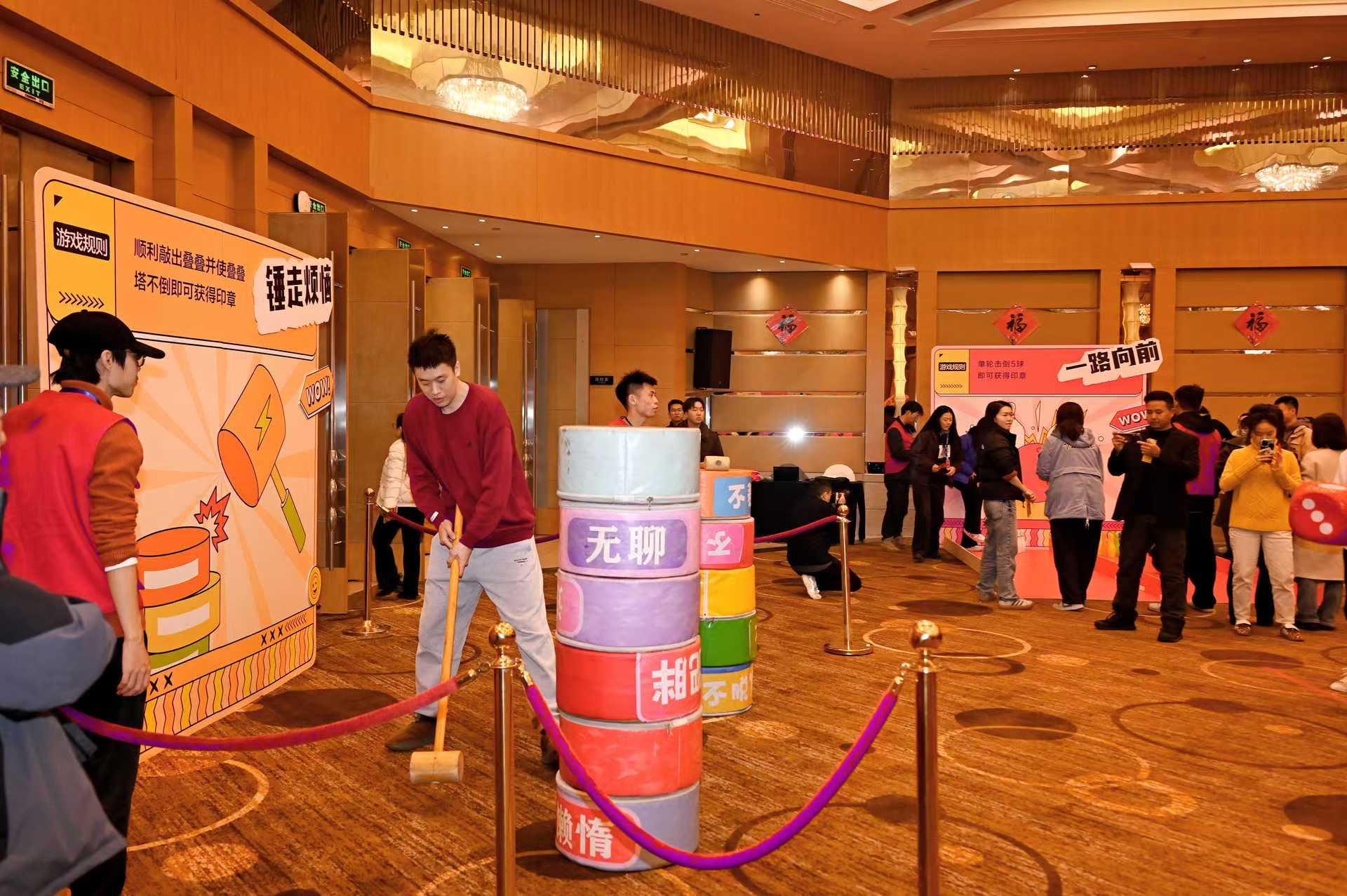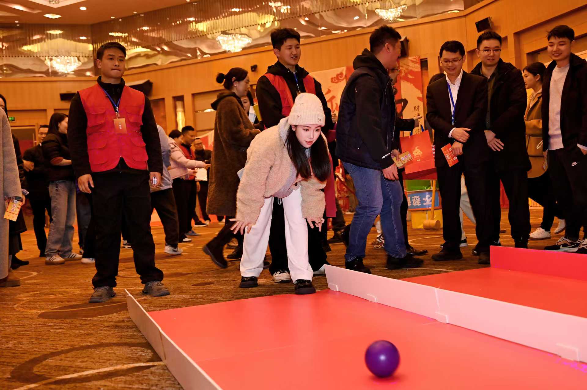 一路向前區(qū),職工們輪流上陣,用力擲出保齡球,體驗運動的樂趣與激情;錘走煩惱區(qū),職工們通過敲擊“煩惱圈”,釋放壓力,享受智慧與技巧的碰撞 ;蛇舞新春區(qū),參賽者屏息凝神,用盡全力推動小球,看它在賽道上蜿蜒;拼出未來區(qū),只見每位職工選手抱著不同顏色和形狀的“方塊”,構建圖案并迅速完成拼裝。