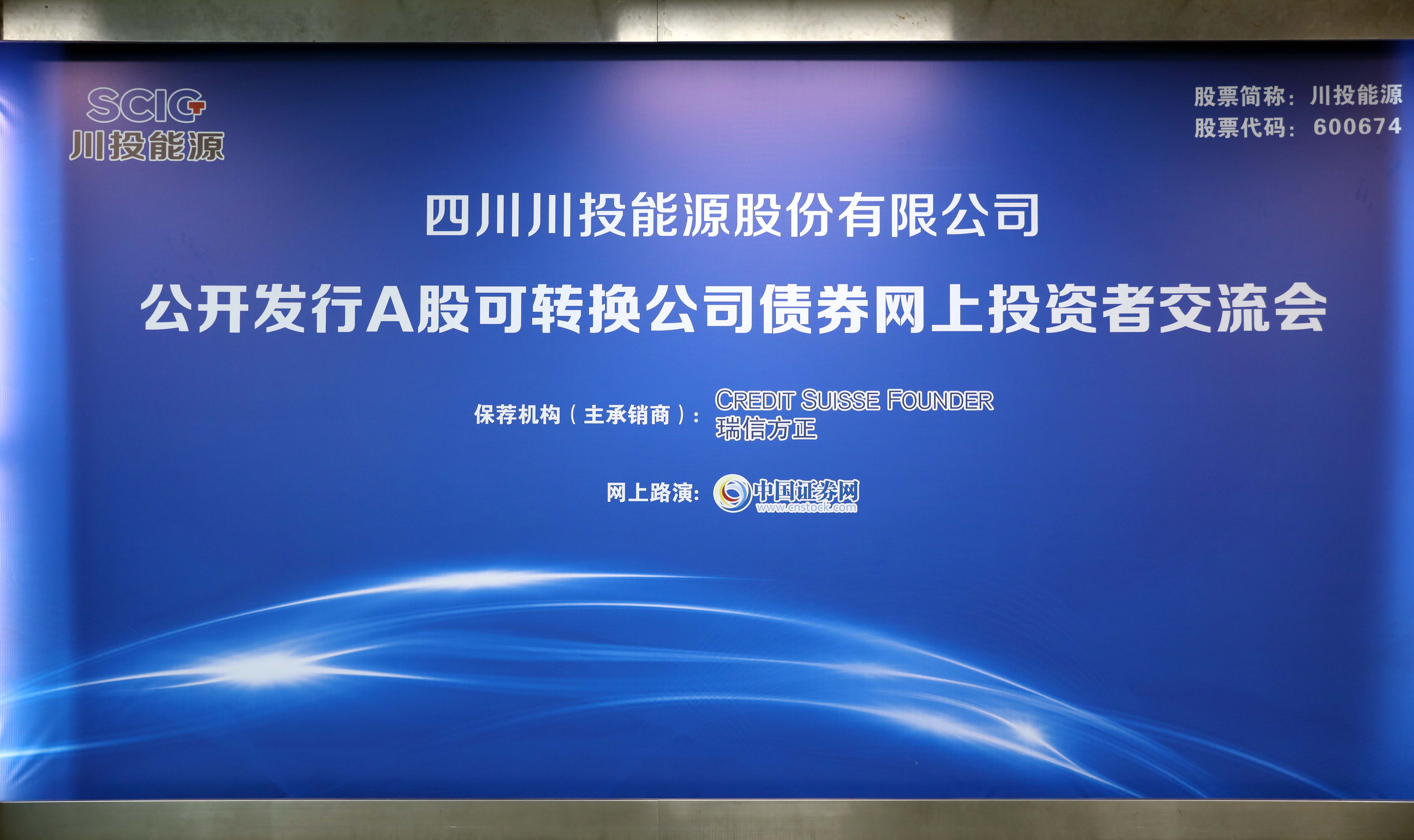 2019年11月8日,川投能源在北京舉行公開發行A股可轉換公司債券網上投資者交流會,公司黨委書記、總經理楊洪,董事會秘書龔圓,可轉債保薦機構——瑞信方正投資銀行部董事總經理趙留軍,上海證券報(中國證券網)總監賀建業等嘉賓出席活動,通過網絡同廣大投資者和網友朋友們進行了精彩紛呈的互動交流。