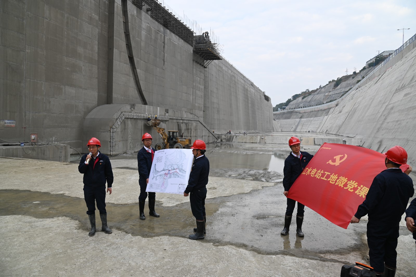在導(dǎo)流明渠基坑里,徐孝剛書記為大家講授了一堂別開生面的工地微黨課。他講到,今天站在已澆筑完成的導(dǎo)流明渠基坑,大家都應(yīng)倍感自豪,今天也是最后一次在導(dǎo)流明渠基坑里開展微黨課。再過兩天,我們的導(dǎo)流明渠就要過流了,回顧導(dǎo)流明渠施工的一年多時(shí)間里,我們克服了新冠疫情影響、征地拆遷滯后、邊坡地質(zhì)條件差、砂石骨料短缺等重重困難,今天的成果來之不易,靠的是全體參建單位、全體員工的共同努力,今天在這里要再向大家道一聲感謝,正是你們的艱苦付出和無私奉獻(xiàn),才取得了我們今天的驕人成績。徐孝剛還對照圖紙和現(xiàn)場的施工實(shí)體,再次向大家普及了縱向圍堰、消力池、正常蓄水位、死水位等水電站施工的基礎(chǔ)知識(shí),向大家講解了銀江水電站巖埂拆除、大江截流、檢修閘門和三期擋水發(fā)電等重點(diǎn)知識(shí)。徐孝剛強(qiáng)調(diào),按期保質(zhì)保量推進(jìn)工程進(jìn)度是我們的“初心”,把銀江水電站建設(shè)成為“精品工程、樣板工程、陽光工程”是我們的“使命”。在這最關(guān)鍵的時(shí)期,大家要再接再厲,保持緊張有序,做到萬全準(zhǔn)備,嚴(yán)把各個(gè)關(guān)口,確保導(dǎo)流明渠過流和大江截流的按期順利實(shí)現(xiàn),用最優(yōu)異的成績?yōu)?021年畫上圓滿句號,為建黨百年獻(xiàn)上銀江賀禮。