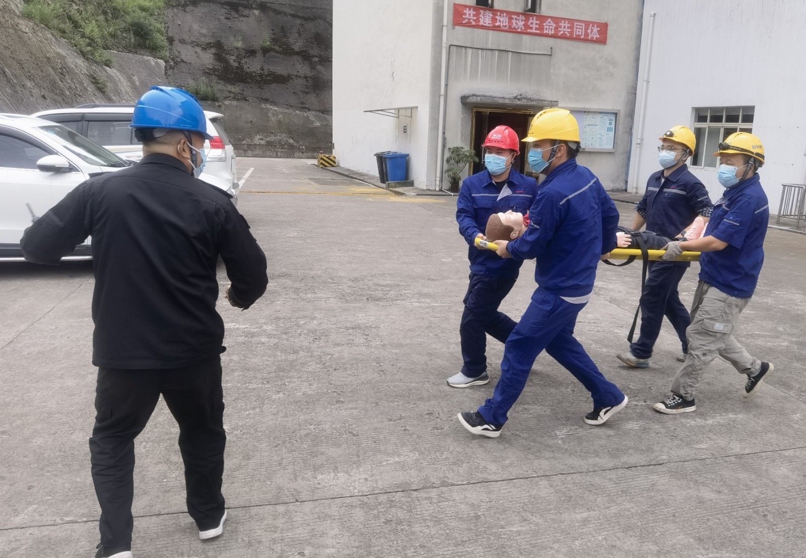 隨著總指揮一聲令下,演練正式開始?!耙幻麊T工突然暈倒,情況不明”,接到指令后,總指揮立即啟動有限空間作業現場應急處置方案,各演練小組攜帶救援設備迅速到位,穿戴變壓式呼吸機進入集水井將傷員救出,“傷員無外傷、無呼吸、無心跳”救援組對傷員情況作出基本判斷后立即實施心肺復蘇急救,用擔架轉移傷員至安全地帶,在119、120到達事故現場后,傷者移交120。各演練小組協同119對事故現場進行后續檢查,無次生風險。