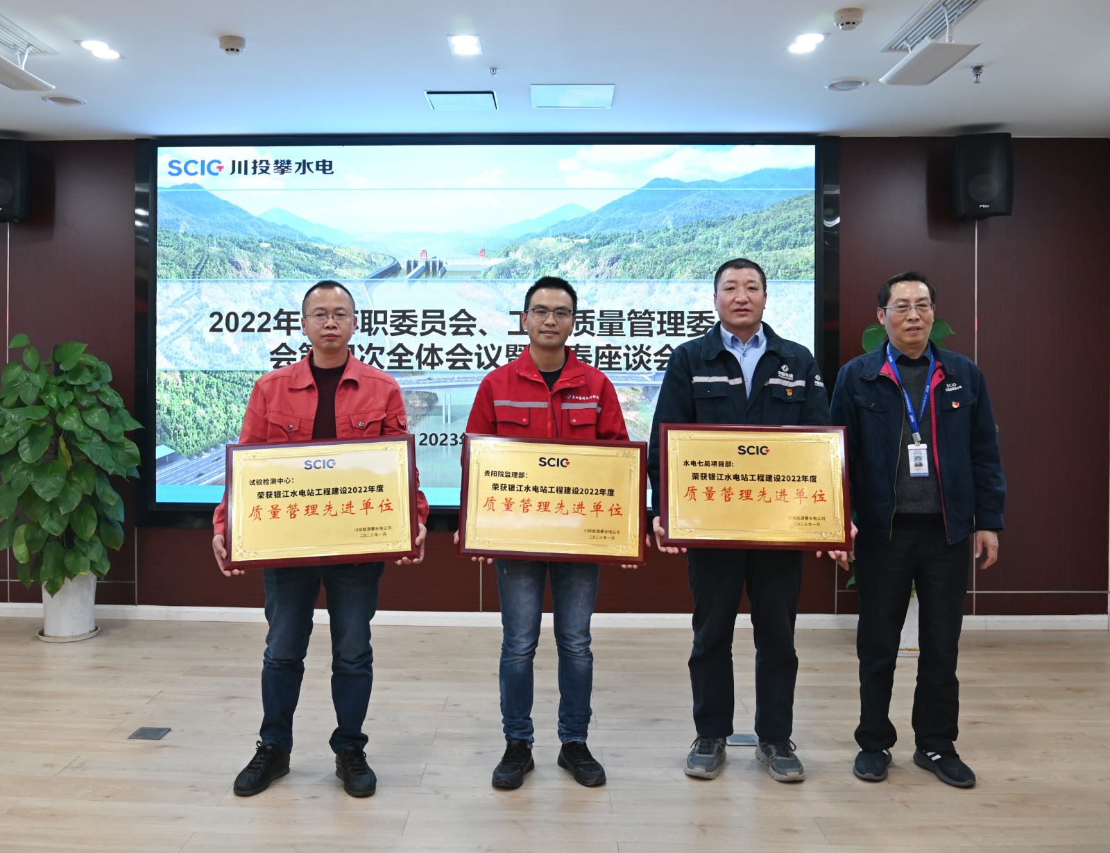 會上,公司黨總支副書記、董事會秘書、工會主席鄧勇宣讀了《關于表彰銀江水電站2022年度質量管理先進單位、先進集體和先進個人的通報》文件,徐孝剛向榮獲2022年度質量管理先進單位的試驗檢測中心、貴陽院監理部、水電七局項目部頒發了獎牌,公司總經理助理兼工程管理部經理嚴瑞平向先進集體代表頒發了獎牌。吳巍嶼組織參會人員向獲獎的單位、集體及個人表示了祝賀,要求其在今后的質量管理工作中發揮好先鋒模范帶頭作用,促進各參建單位共同提高質量管理水平,把銀江水電站建設成“精品工程、樣板工程、陽光工程”。