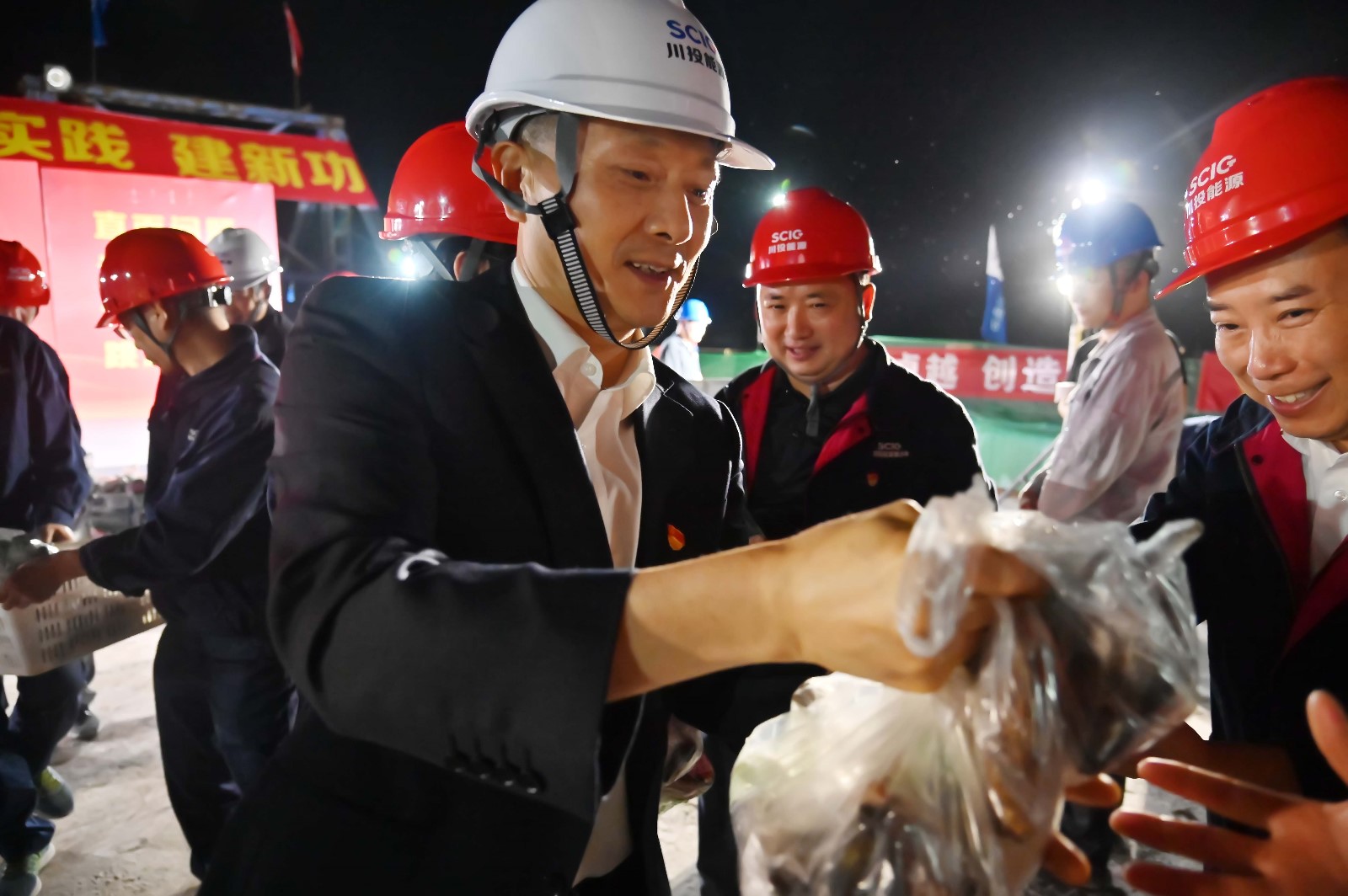 儀式開始前,受川投能源黨委書記、副董事長(zhǎng)、總經(jīng)理?xiàng)詈槲校教m平一行慰問了挑燈夜戰(zhàn)在銀江大橋的一線工友們,把熱乎乎的雞腿、粽子、咸鴨蛋、牛奶等送到一線人員的手中。