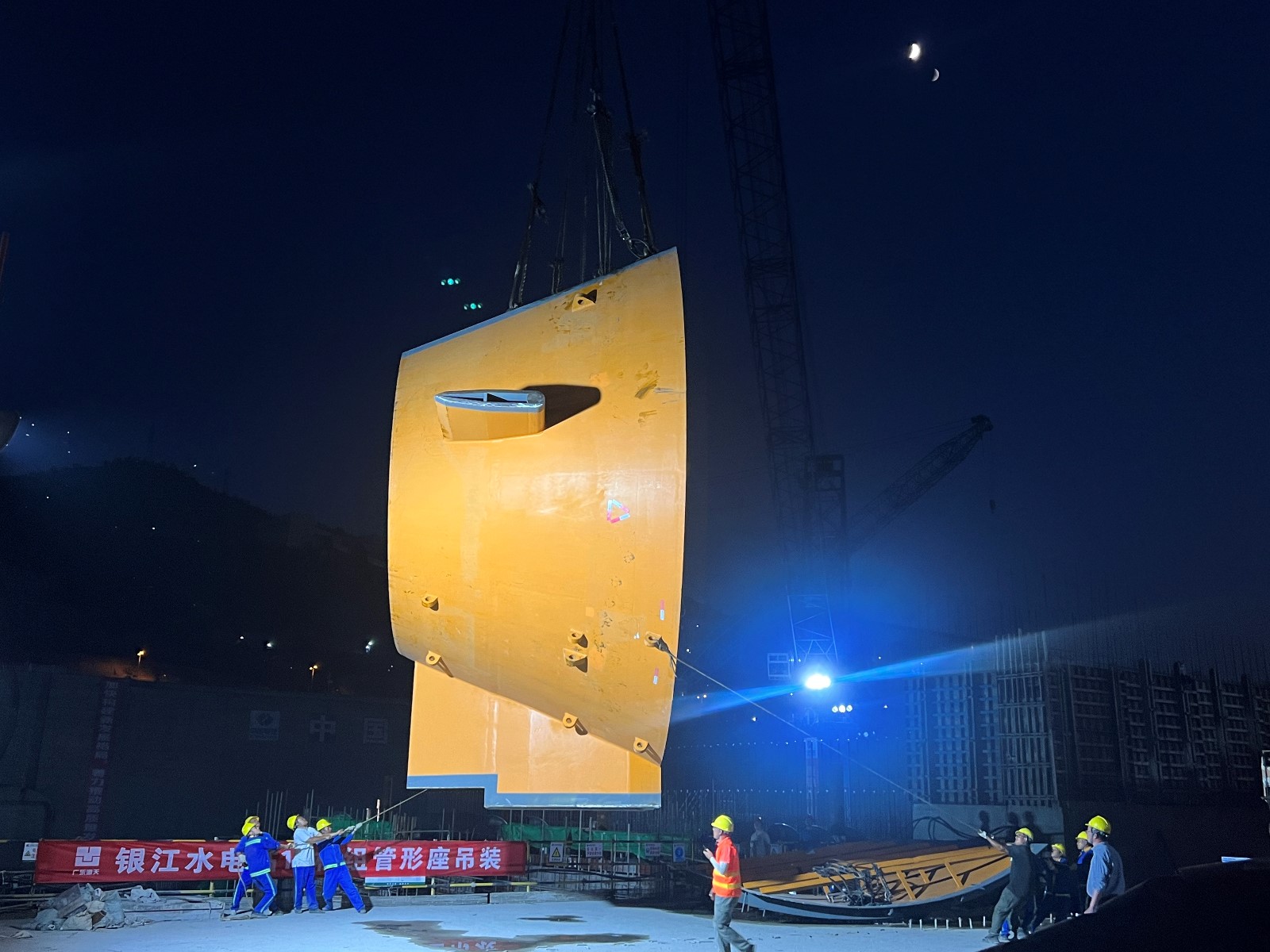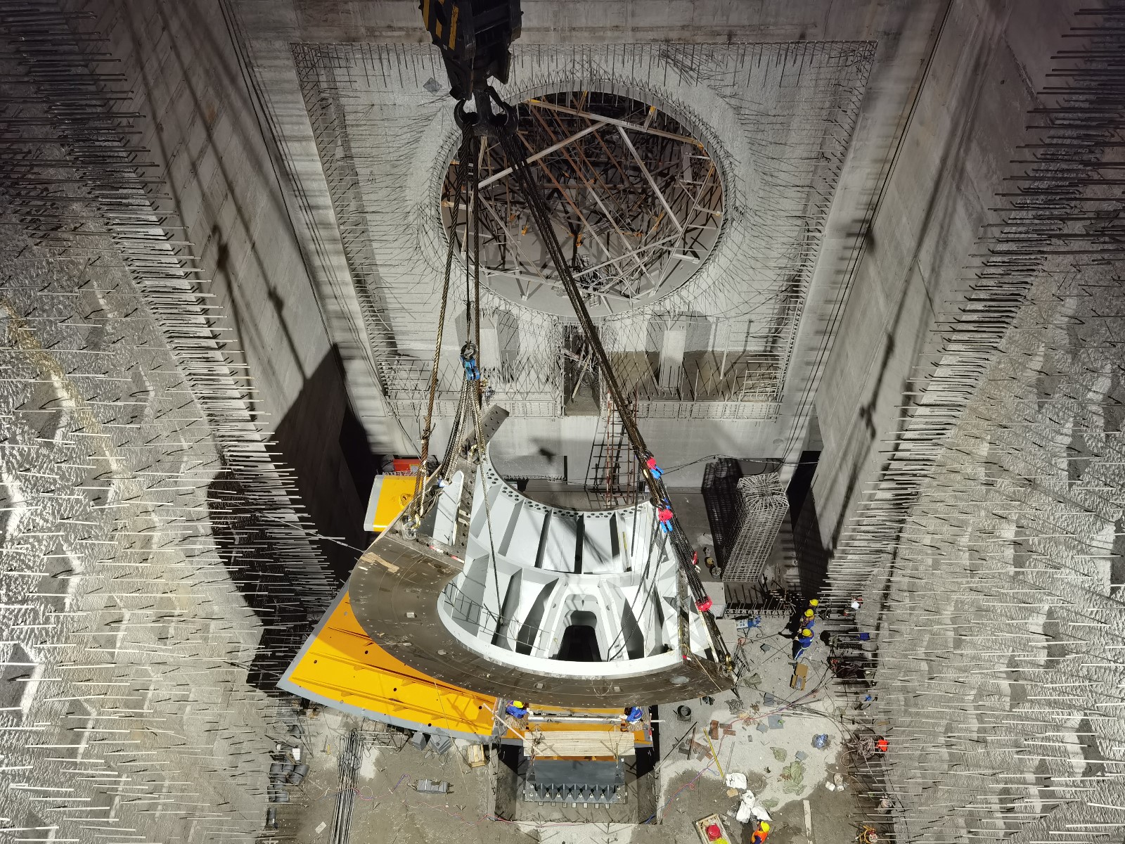 10月20日履帶吊車試吊驗收及下固定導葉順利吊裝完成后,從20日16點開始至21日20:00結束,歷經運輸、翻身及吊裝三個階段長達18個小時工作,管形座最重件第一瓣內殼在公司領導的現場指導下穩穩落至安裝位置,后續公司將組織參建單位一鼓作氣將首臺機組管形座剩余內殼、外殼、前錐體及固定導葉等悉數吊裝到位,力爭年底完成安裝工作,為實現2025年一季度首臺機組投產發電目標打下堅實基礎。