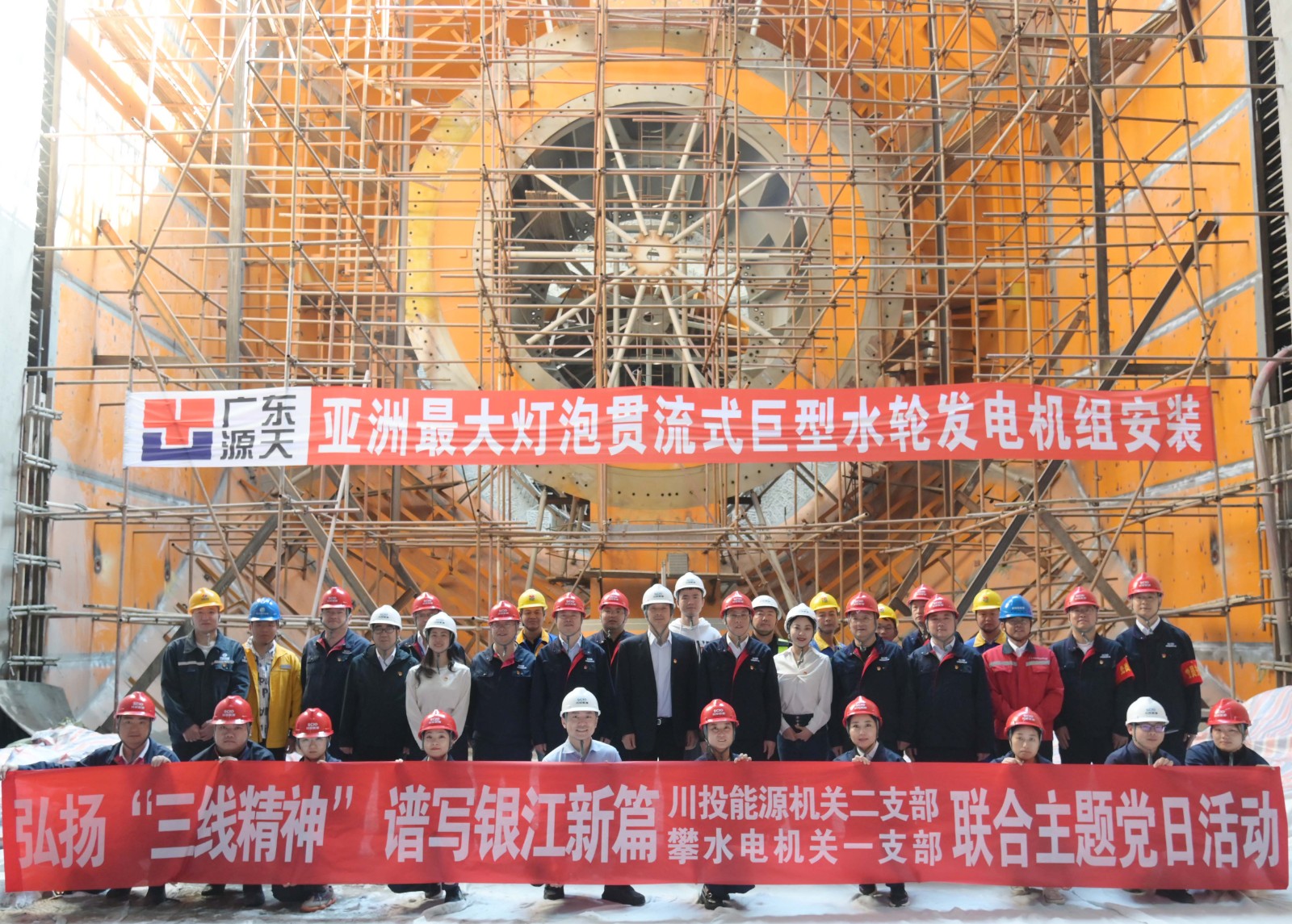 在銀江水電站亞洲最大燈泡貫流式巨型水輪發電機組安裝現場,川投能源機關二支部書記李睿講授了工地微黨課《承諾》,與大家一起重溫銀江水電站建設過程中的感人故事。活動中,徐孝剛用通俗易懂的語言,為現場同志介紹了銀江水電站的建設特點、施工情況和下一步工程建設計劃,并號召全體黨員和團員青年要圍繞“保一爭二”提前發電重要目標,團結一心、勇挑重擔、善作善成。