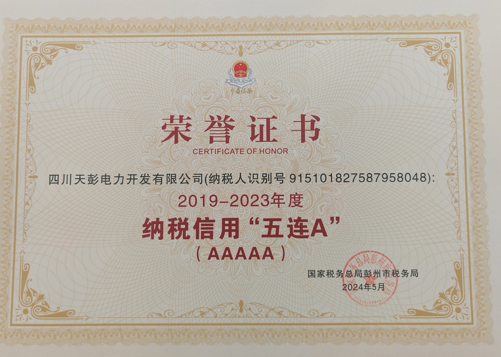 6月11日,天彭電力喜獲殊榮:國家稅務總局彭州市稅務局向我公司授予了“彭州市‘2019-2023年度納稅信用五連A’”榮譽證書,這是稅務機關對我公司誠信納稅、守法經營的肯定和表彰。