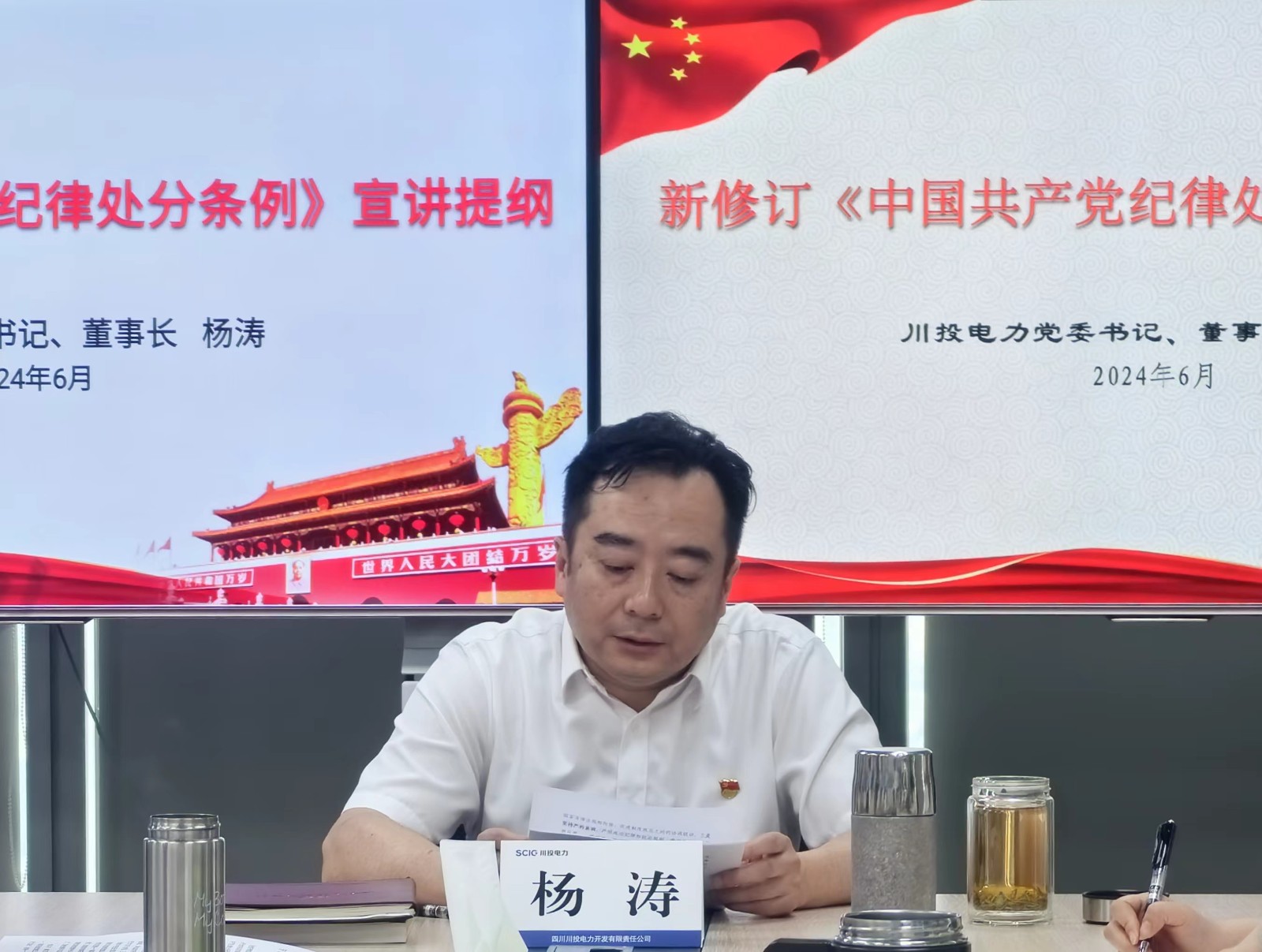 為深入貫徹落實習近平總書記關于黨的自我革命的重要思想,引導黨員干部職工增強紀律意識,強化思想武裝,提升黨紀學習教育成效,按照川投電力黨委關于開展黨紀學習教育的工作安排,6月24日上午,川投電力黨委書記、董事長楊濤講授黨紀學習教育紀律黨課。川投電力黨委委員、紀委書記謝麗主持會議。