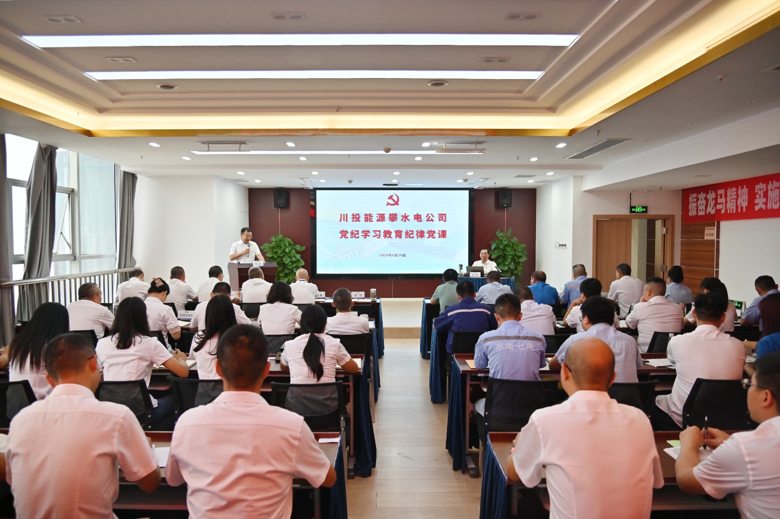 在全黨開展黨紀(jì)學(xué)習(xí)教育和黨的103歲生日來臨之際,按照川投能源黨委和攀水電黨總支的安排部署,6月30日上午,川投能源副總經(jīng)理、攀水電公司黨總支書記、董事長徐孝剛講授了黨紀(jì)學(xué)習(xí)教育紀(jì)律黨課并宣講省委十二屆五次全會精神,公司全體員工、參建單位負(fù)責(zé)人及黨員代表共計(jì)50余人參加。
