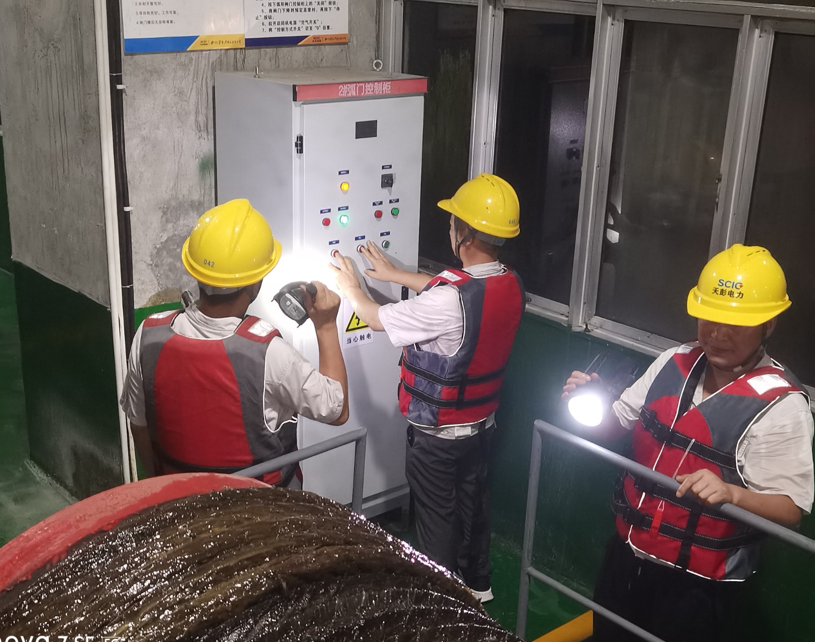 汛情就是命令,防汛就是責任,對于天彭電力人來說,這注定是個不眠之夜。公司領導現(xiàn)場指揮,及時處置各類突發(fā)情況,值班人員兵分三路、各司其職,一路駐守控制室,密切關注雨情、水情變化,作好信息收集和傳達;一路前往防汛重點部位進行巡視檢查,確保設備設施運行正常;一路做好應急搶險準備。