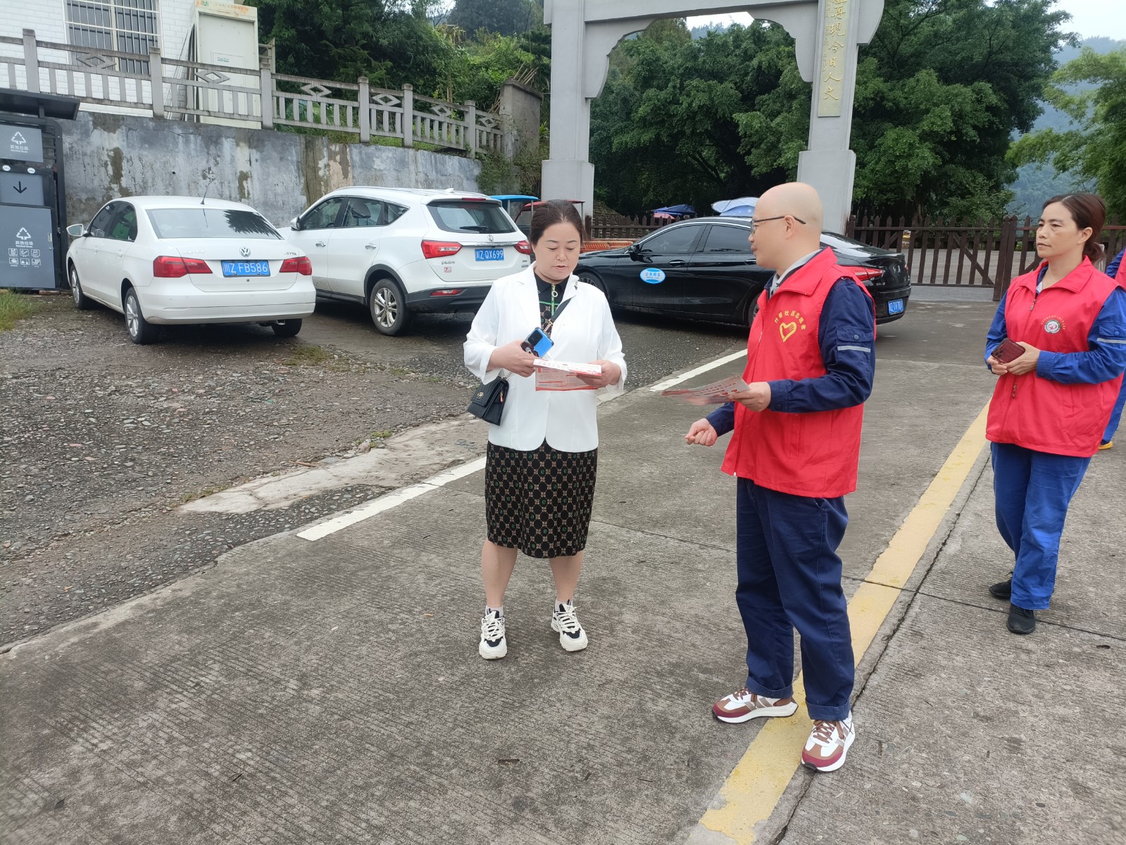 在槽漁灘風景區入口,面對到來的游客,支部黨員張華耐心地為游客提供景區景點、游覽路線、交通信息等咨詢服務,確保游客能夠順利游覽景區。黨員鄭健在景區停車場區域,協助景區工作人員維持交通秩序,引導游客有序停車,確保游客安全與景區秩序平穩。黨員何曉紅、發展對象楊杰主動向游客普及國家安全與森林防火知識,引導廣大游客自覺維護國家安全,自覺遵守森林防火規定。