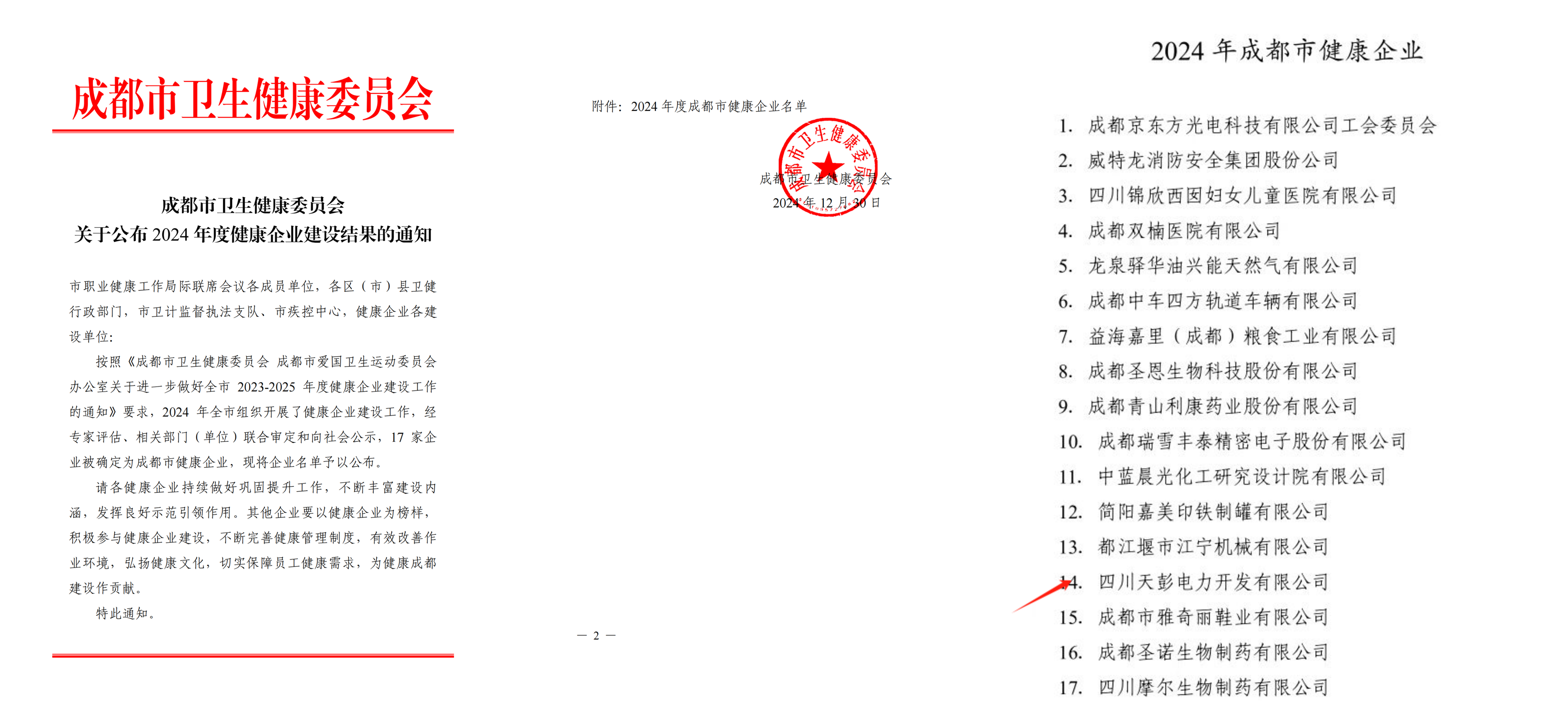 近日,成都市衛生健康委員會公布2024年度健康企業建設結果,天彭電力公司順利通過專家組評審驗收,被評為“2024年成都市健康企業”。
