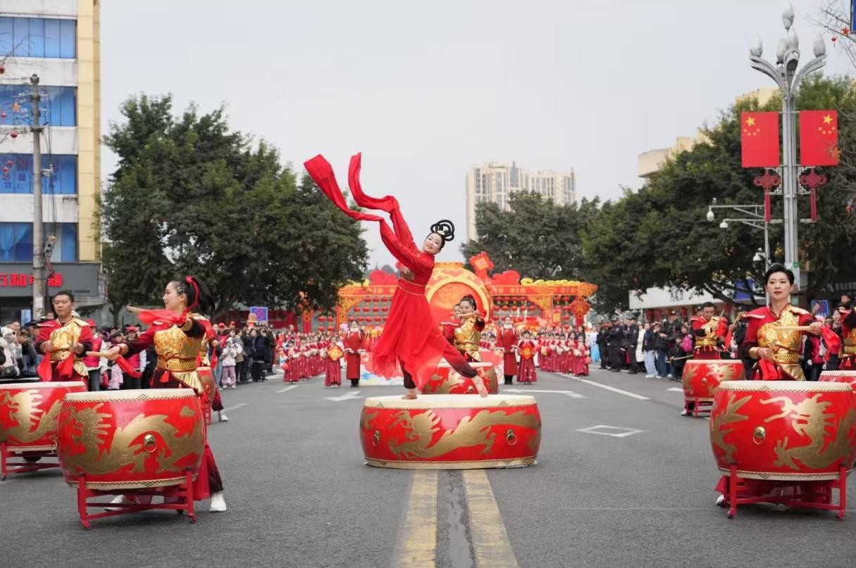 洪雅民俗文化巡展活動是洪雅縣每年春節期間的傳統文化品牌,表演節目豐富多彩、精彩紛呈,深受全縣人民喜愛。活動當日,民俗文化巡游隊伍從三彩廣場出發,一直到洪雅廣場,現場人頭攢動,熱鬧非凡。隨著激昂的鼓點響起,大鼓隊員們手中的鼓槌上下翻飛,富有節奏感地敲擊著大鼓。磅礴的氣勢、靈動的韻律、美妙的舞姿瞬間點燃了現場氣氛,吸引了眾多市民駐足觀看、拍手稱贊。