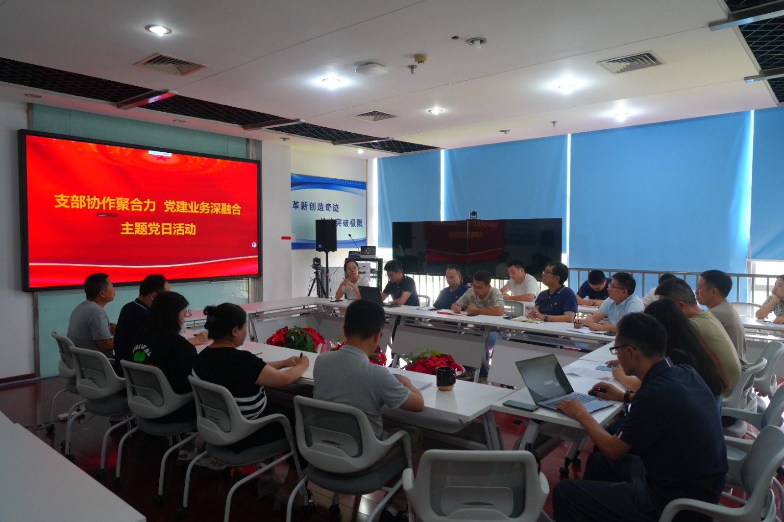 為進(jìn)一步探索黨建與業(yè)務(wù)深度融合路徑,提升黨建質(zhì)量、激活發(fā)展動(dòng)能,共同推進(jìn)黨建工作與業(yè)務(wù)工作同頻共振,7月24日,交大光芒黨總支所屬三個(gè)黨支部聯(lián)合開展“支部協(xié)作聚合力,黨建業(yè)務(wù)深融合”主題黨日活動(dòng)?;顒?dòng)由第一黨支部書記、公司副總工程師王輝主持,各支部黨員參加。
