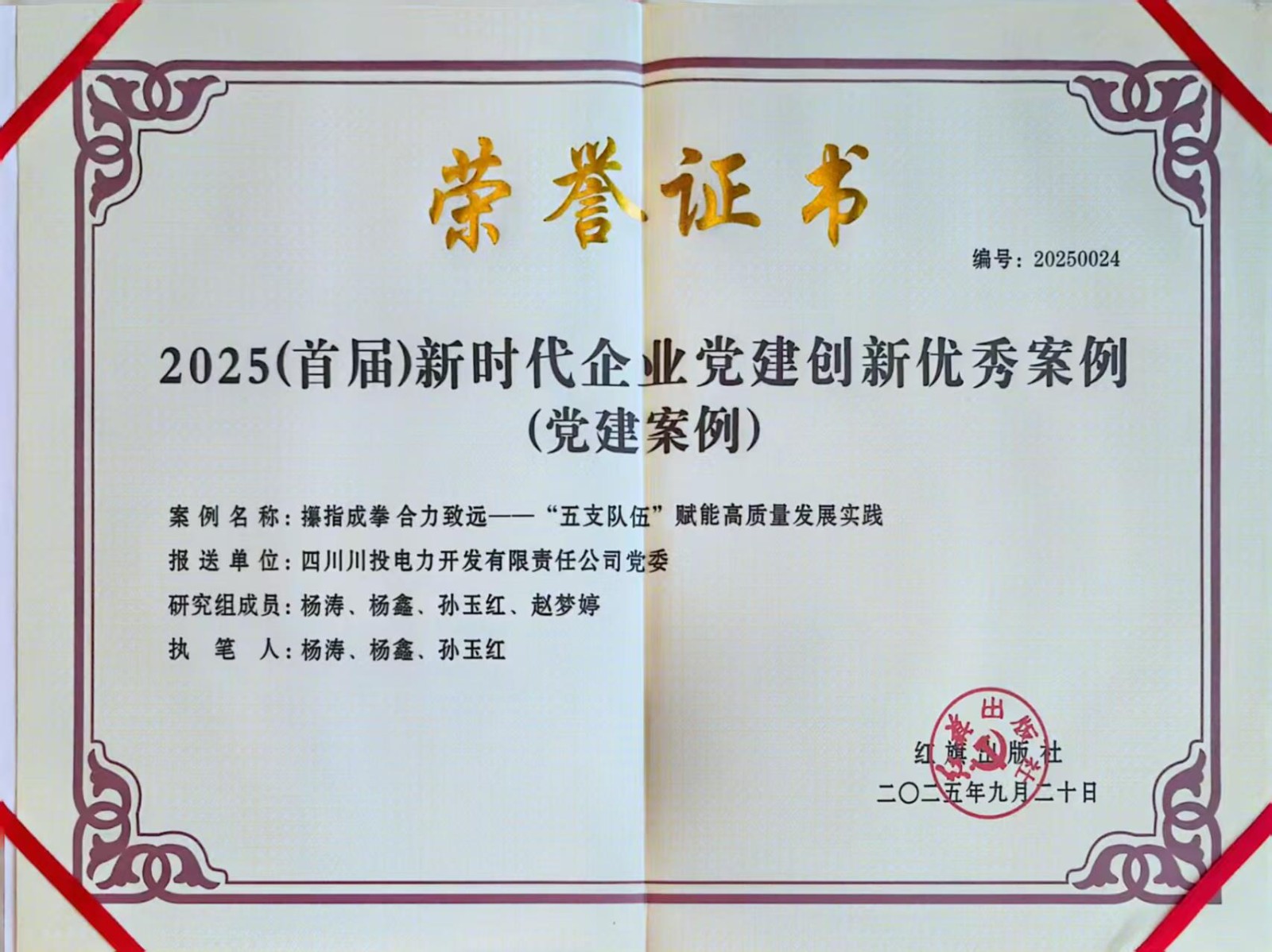 9月20日,由紅旗出版社主辦的2025(首屆)新時代企業(yè)黨建經(jīng)驗交流會暨企業(yè)黨建創(chuàng)新優(yōu)秀案例發(fā)布儀式在北京舉行。川投能源所屬川投電力黨委申報的案例《攥指成拳 合力致遠——“五支隊伍”賦能高質(zhì)量發(fā)展實踐》,從1400余家企業(yè)中脫穎而出,成功入選本屆黨建創(chuàng)新優(yōu)秀案例。