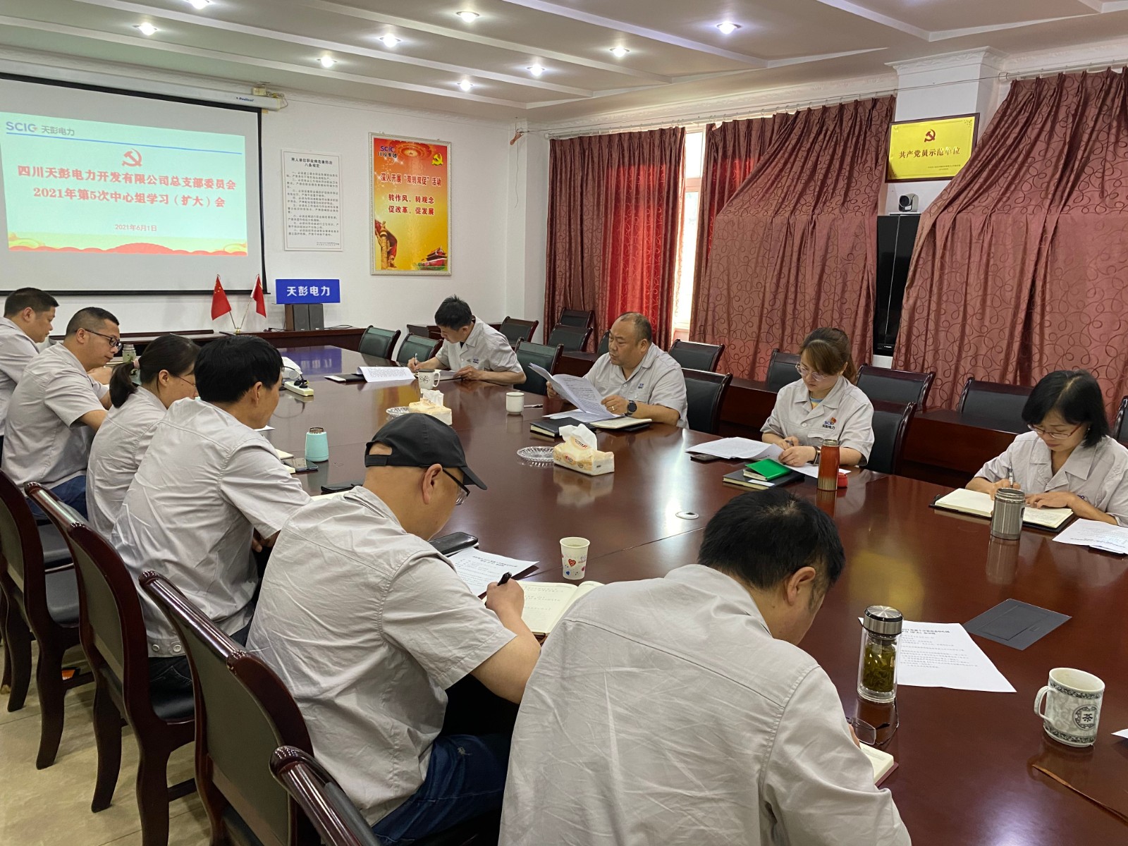 6月1日上午,川投能源天彭電力黨總支在公司二樓會議室召開2021年第5次中心組學習(擴大)會,公司領導、黨員干部、關鍵崗位人員參加會議,會議由黨總支書記、總經理陳忠主持。