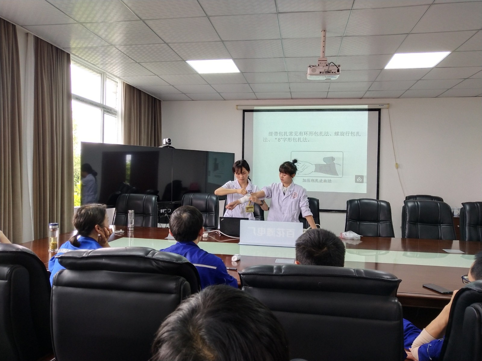 培訓老師結合多年的臨床經驗及電站工作特點,通過播放幻燈片和視頻、展示實物、現場演示等形式,以近年來發生在身邊的鮮活事例,向學員們強調了應急救護“黃金四分鐘”的重要性,隨后逐一講解了胸外按壓、人工呼吸、止血、包扎、骨折固定、傷員搬運等急救理論與施救技巧,并現場實操心肺復蘇、繃帶、三角巾包扎等方法,教會工人遇到意外傷害時如何就地取材進行初步應急處理,同時還與電站員工現場互動,手把手的傳授相關操作技能,以確保學員能夠充分掌握并正確運用。