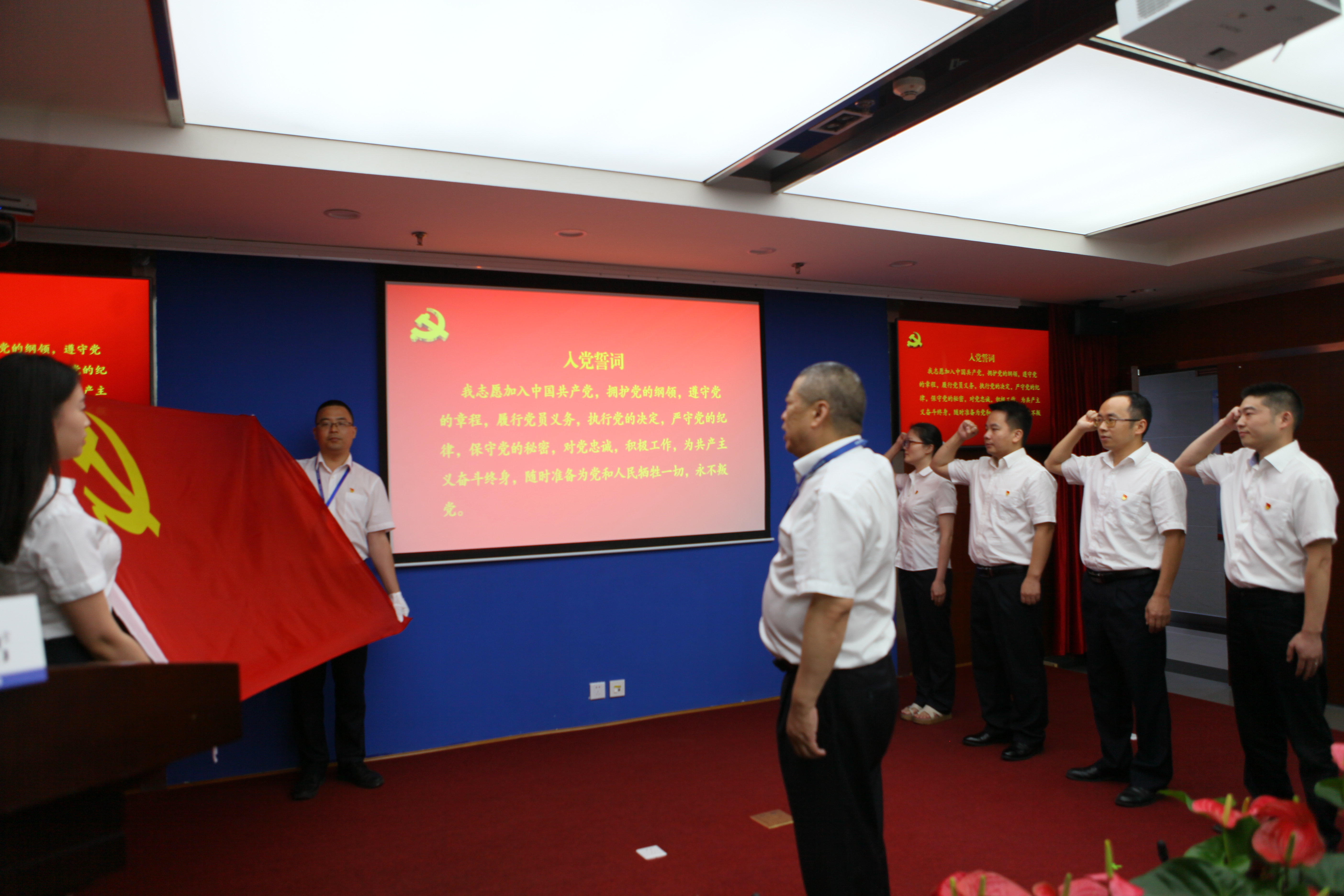 會議在雄壯的國歌中拉開序幕。與會黨員和新黨員代表在公司黨委書記、副董事長、總經理楊洪同志的帶領下,舉起右拳,面向鮮紅的黨旗莊嚴宣誓。鏗鏘有力的誓言在耳邊久久回蕩,讓新老黨員進一步堅定了入黨信念,增強了黨性意識,鞭策和激勵著大家履職盡責、干事創業,以新氣象、新作為兌現對黨的莊嚴承諾。